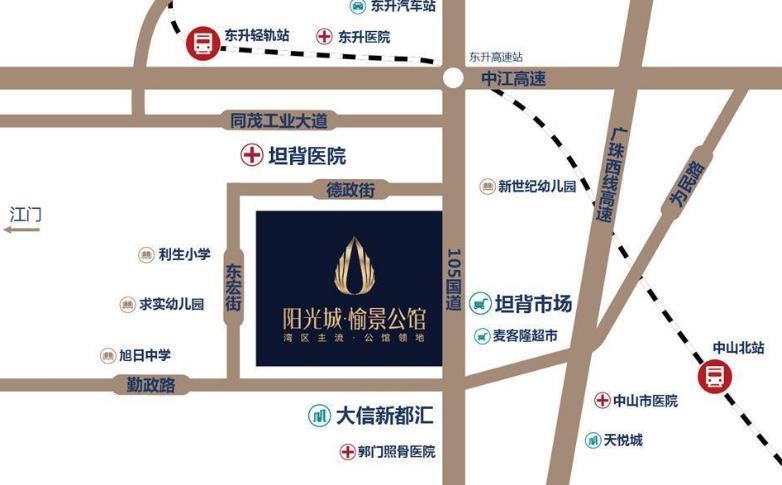 阳光城·愉景公馆,由世界500强旗下,中国地产TOP20开发打造,也是阳光城集团进驻中山的 楼盘。项目位于原坦背镇政府及东升华盛学校旧址,紧靠城市动脉——105国道,周边居住氛围浓厚。